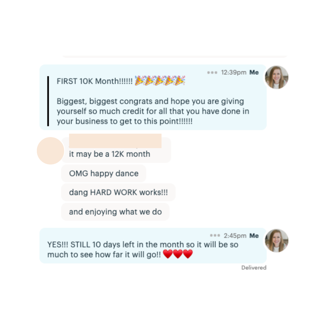 My momentum continues to compoundβ¦ I just celebrated my first $50K month! I sure did put in the work but having a coach has been absolutely essential through this rollercoaster that is entrepreneurship and I also built an all-female dream team so that I could work WAY less than I did in ANY previous business! Anna helped me get the clarity and momentum I needed at every level to actually figure out the business that truly fit ME and truly felt aligned (one that didnβt feel like such a grind)!