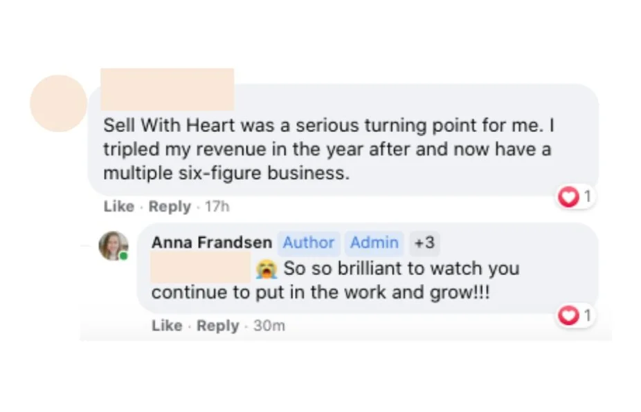 Sell with Heart was a huge turning point for me. I tripled my revenue in the year after and now have a multiple six figure business.β