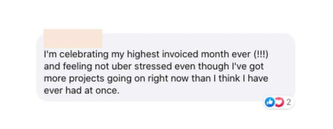I ended the feast and famine cycle and started hitting my income goals consistently month over month. I raised my prices and after the program maintained my momentum even with a 4.5 month old at home working 10-15 hours a week.