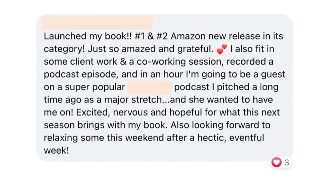 In addition to two successful launches of the program, I signed new 1-1 clients at my highest price yet, and on top of that had four book manuscripts of my own that I'd written that were just like on my computer that I hadn't been able to sell. I ended up selling all four of my manuscripts last year, in large part because of where my mindset was at!
